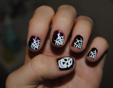 1. Do two solid base coats of your choice color—I chose a shimmery purple since black and white looked a little stark.