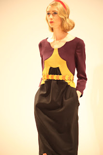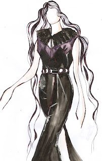 Second day at LFW This time I was at the spijkers en spijkers fashion show Front row At the freemason hall . The show was amazing with contrats of colours mixed of strips purple and gothic pattern . Illustration by Lakeca ( me ) Photo by Amelia gregory. " 2 of these illustration will be feathed in Amelia magazine ameliasmagazine